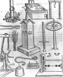 And so, one year and two days after her son had first come to her in her cell, Katharina received a less welcome visit from the prison bailiff and a couple of his minions. They carried the withered old lady, none too gently, to the torture chamber, where there waited three judges, a scribe, and the burly torturer himself. This man brought out the tools of his trade one by one and told about their operation in loving detail while Katharina’s teeth chattered in fear. There were the strapado, the thumbscrews, the Catherine wheel, the hot irons, the rack, the water torture… the whole ingenious roll call of man’s inhumanity to man.